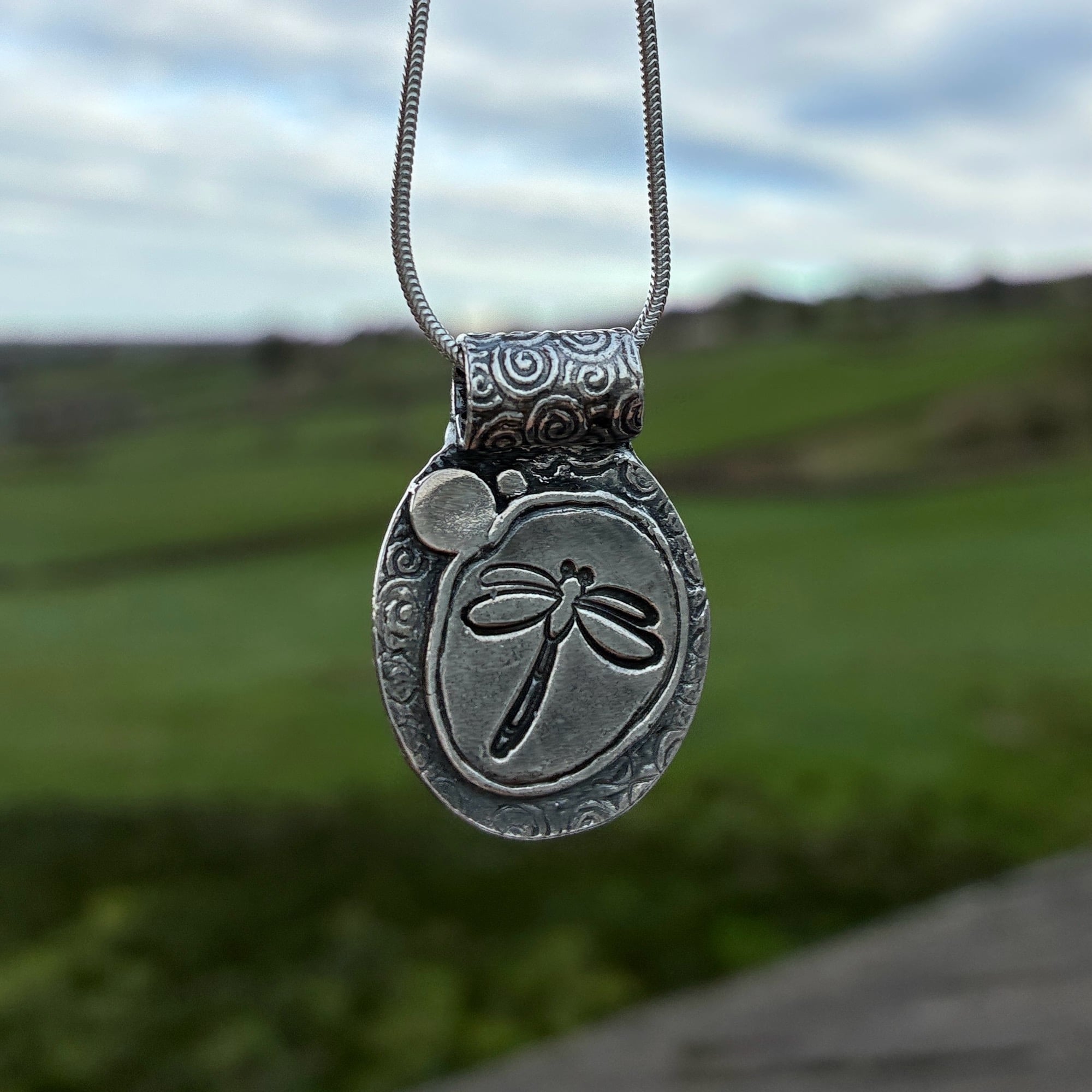 In this Hallmarked Silver Dragonfly Pendant I used layers of textured silver to tell that story: